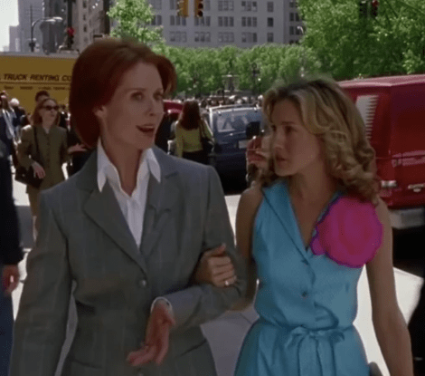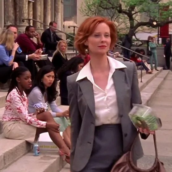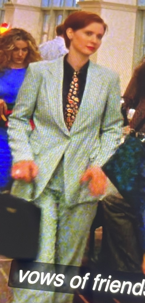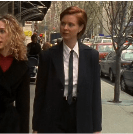 So let’s talk about the fashion in Sex and the City (SATC) starting with Miranda. Miranda? Yes, I know Miranda. Even though a fan favorite when it comes to her personality, I do not see her portrayed as a fashion icon in the show like Carrie, Samantha, or even Charlotte. At least not in the later seasons. However, “Season 1 Miranda”? Oh, she is an icon. I believe the show really focused on using style to showcase the characters’ personalities more in the first season, which makes sense as they were still trying to establish their personas and give the audience a quick understanding of who they were. Miranda was the ambitious lawyer and with that came the suits.